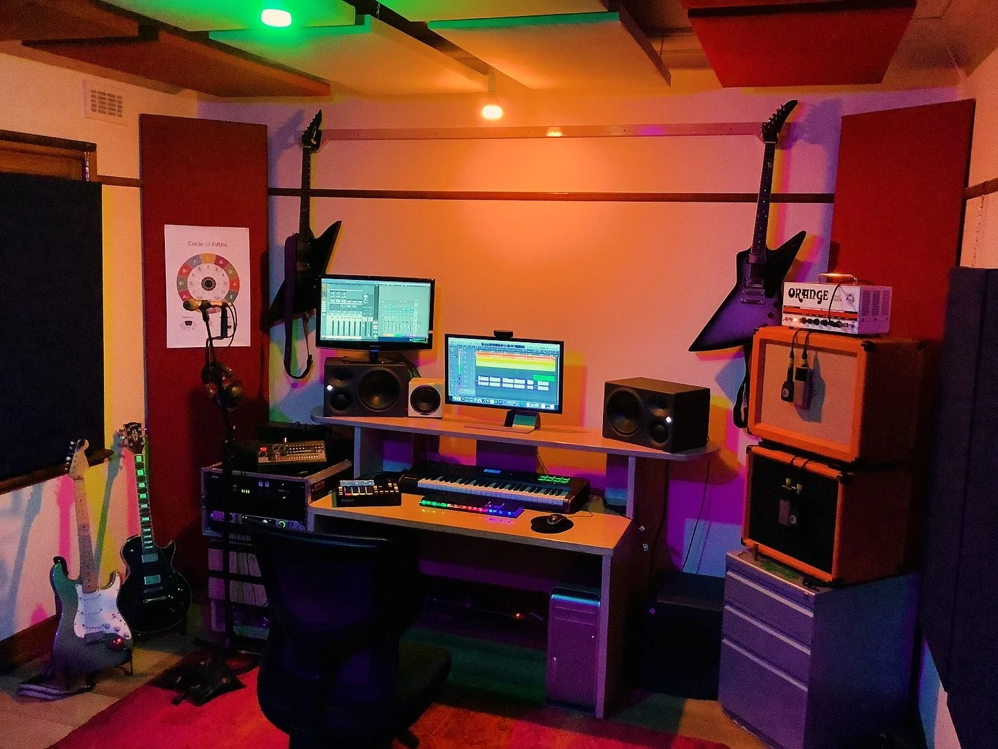 Our monitoring system is made up of Neumann KH310 active monitors and a KH750 DSP subwoofer, with D/A conversion provided by Metric Halo. Our state-of-the-art acoustic treatment was designed & build by Exponential Acoustics.